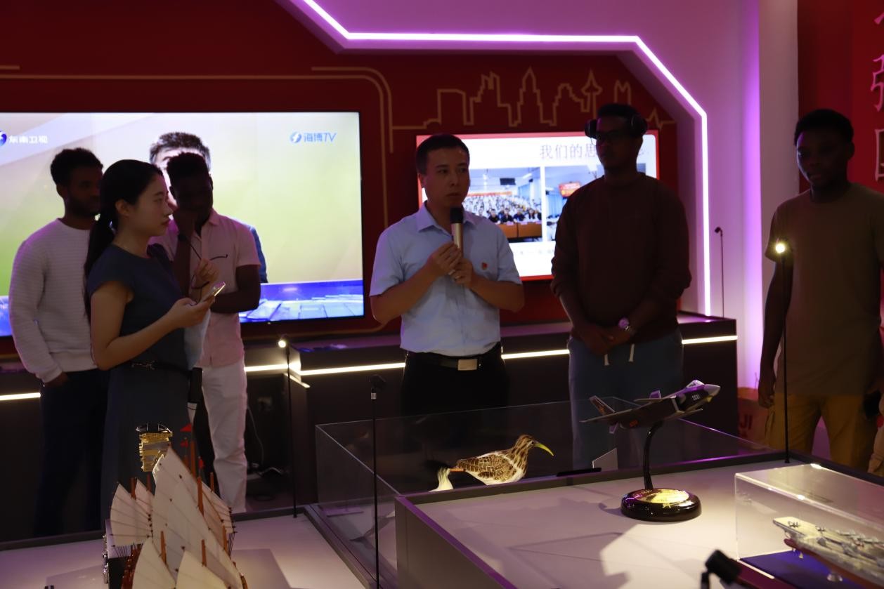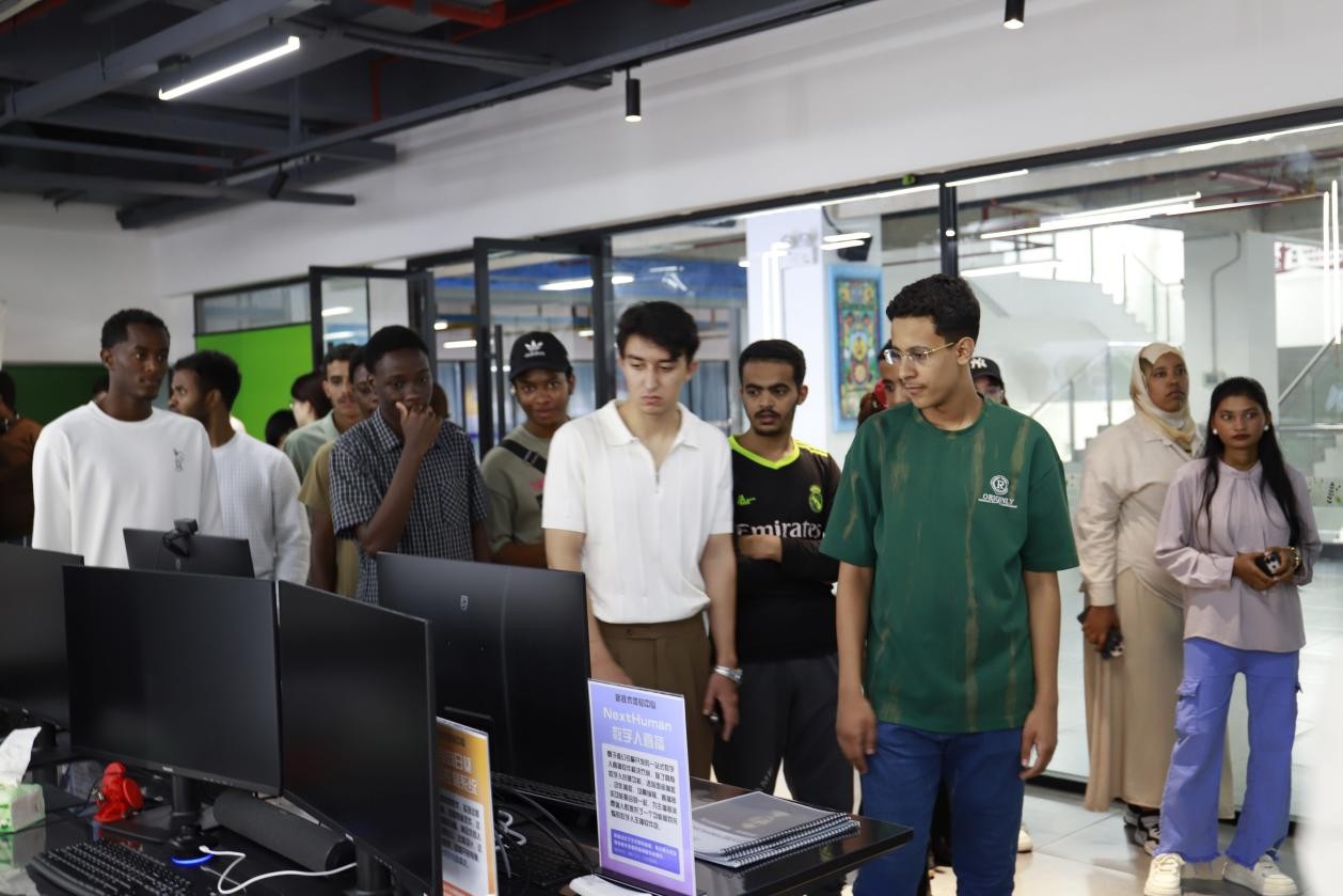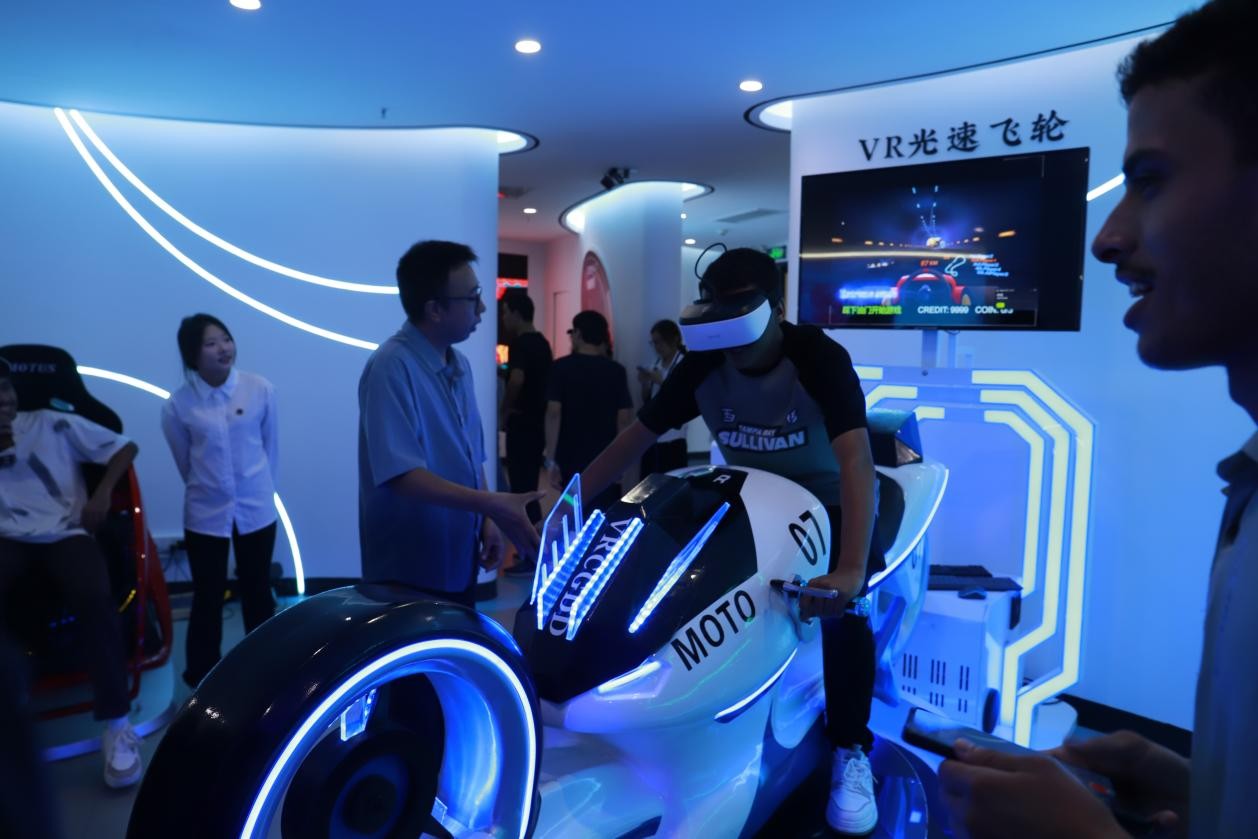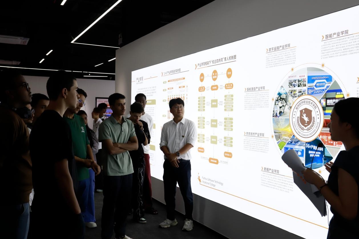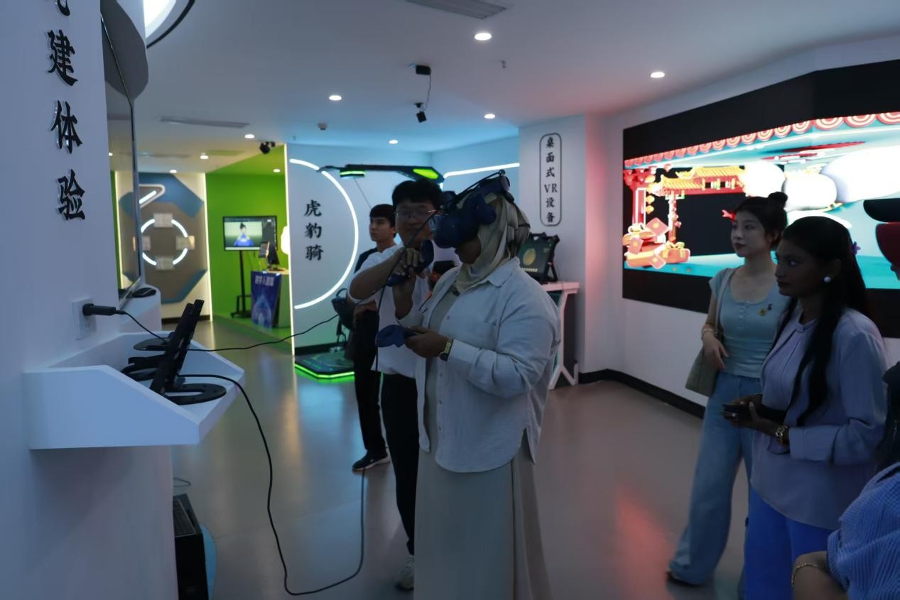 在国际学院老师与志愿者的陪同下,国际语言生们依次参观了我校五四大厅校史展览馆、电子竞技实训室、新技术体验中心、元宇宙体验中心及马克思主义学院“元宇宙+”思政育人创新实践基地等多处教学实践场所。通过实地探访,学生们不仅系统了解了我校的办学历程与发展成就,更亲身体验了VR光速飞轮、VR太空舱等前沿数字化教学项目。他们对学校先进的数字化教学环境、“产教融合”实践平台搭建方面所取得的成果表达了高度赞赏。