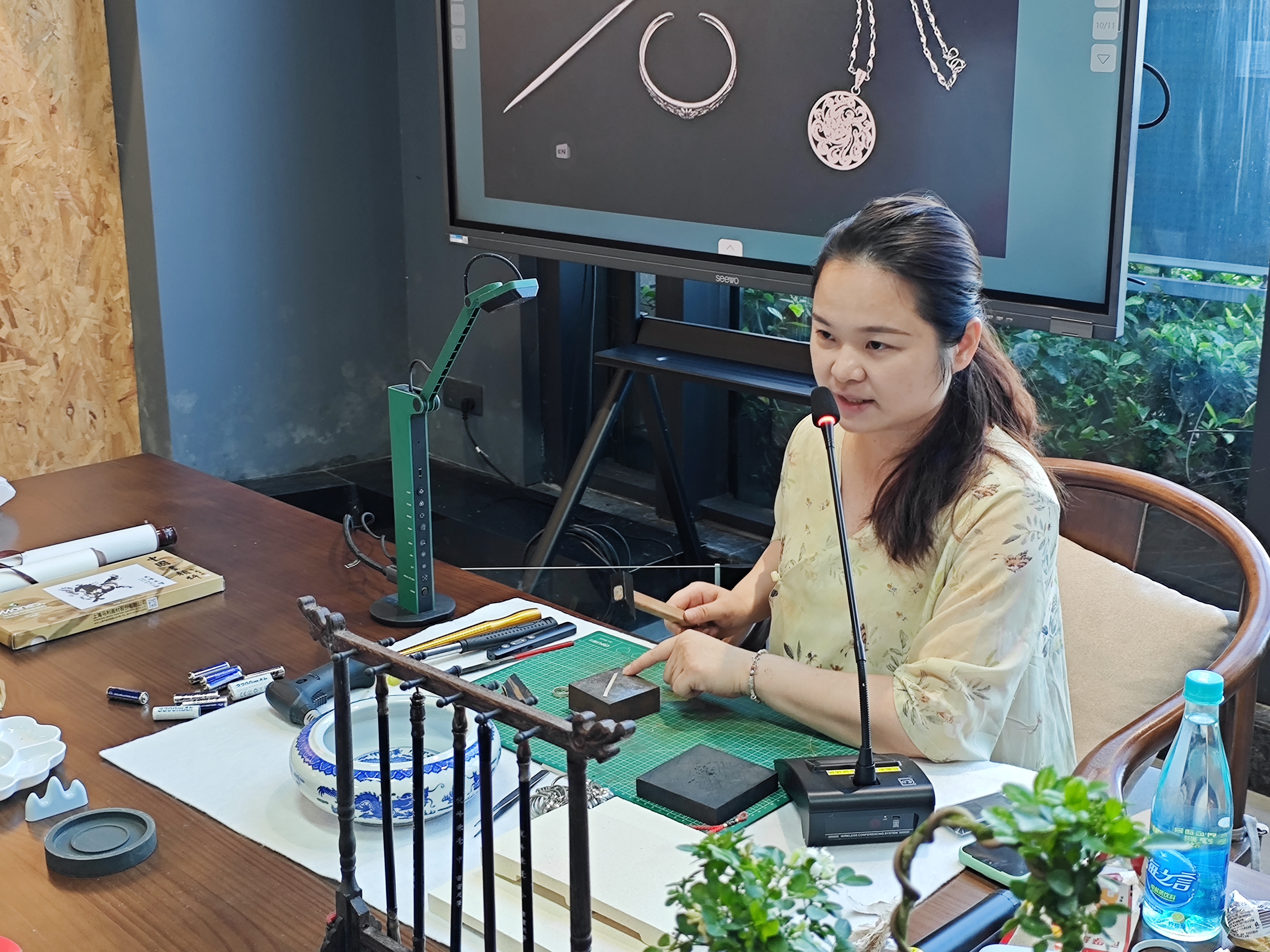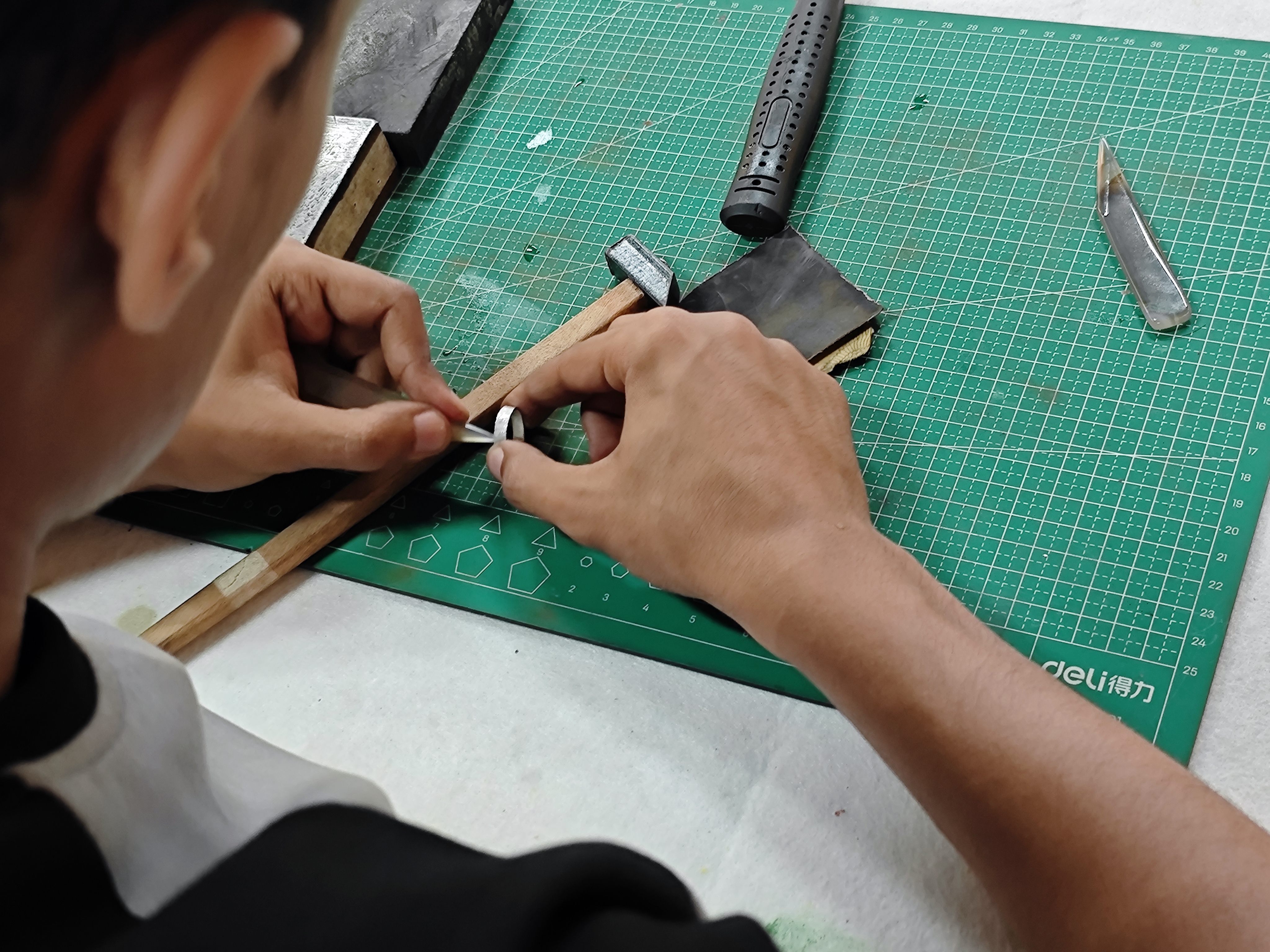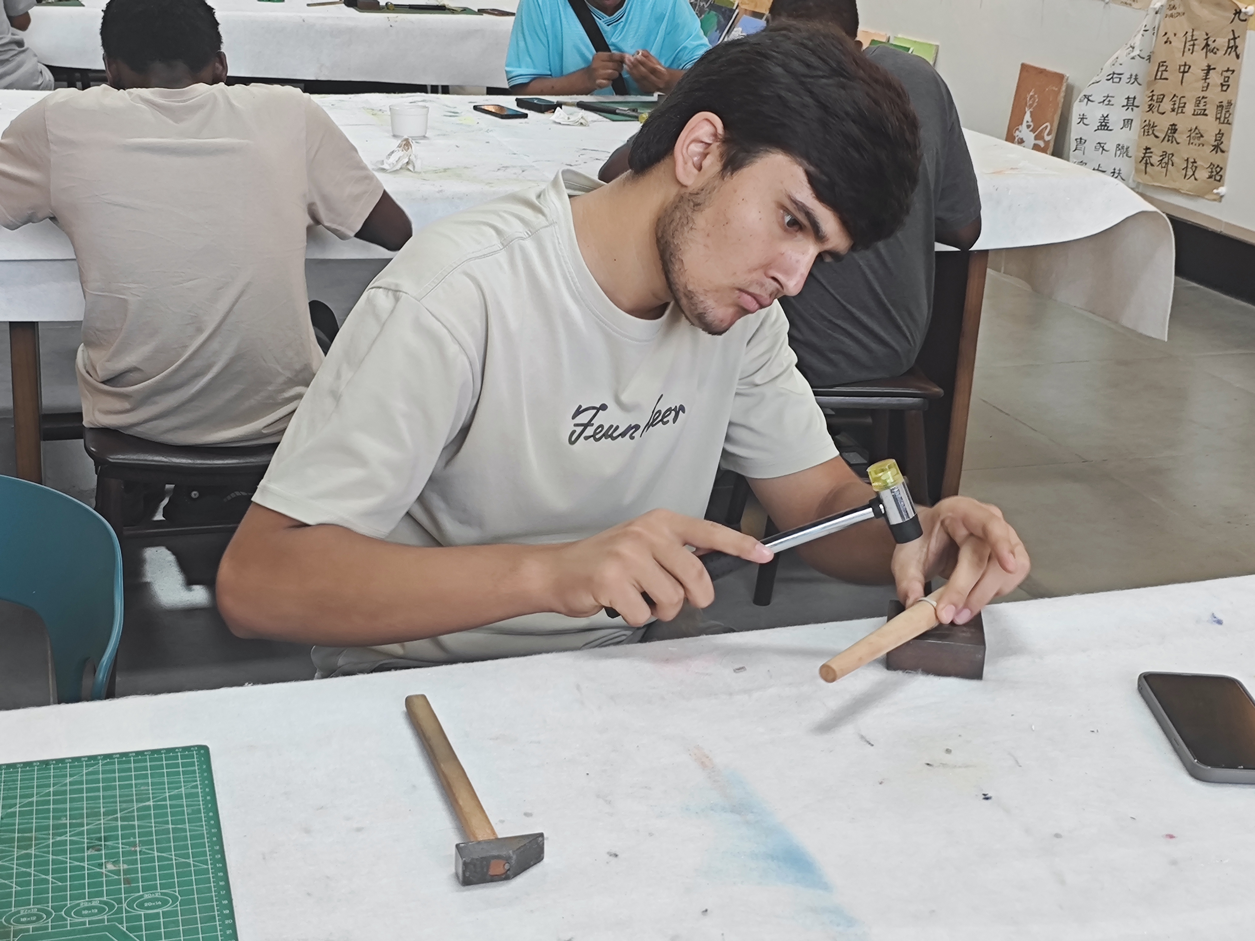 下午的活动转入银饰制作环节。在书画教室内,国际语言生们在郭抒婷老师的指导下,学习了银戒制作的基础工艺。从银料的锻打塑形到纹饰雕刻,从戒圈成型到表面抛光,一枚枚独一无二的银戒,不仅是环绕指间的精致饰物,更成为承载此刻时光与心意的永恒信物。在这段沉浸式的体验里,严谨的工匠精神与东方的造物美学悄然浸润于心。本次活动通过将剪纸与银饰制作两项传统工艺相结合,既展现了中华优秀传统文化的丰富内涵,又体现了传统工艺在现代教育中的创新应用,能够帮助国际学生更深入地理解中国传统文化精髓,促进跨文化交流与理解。