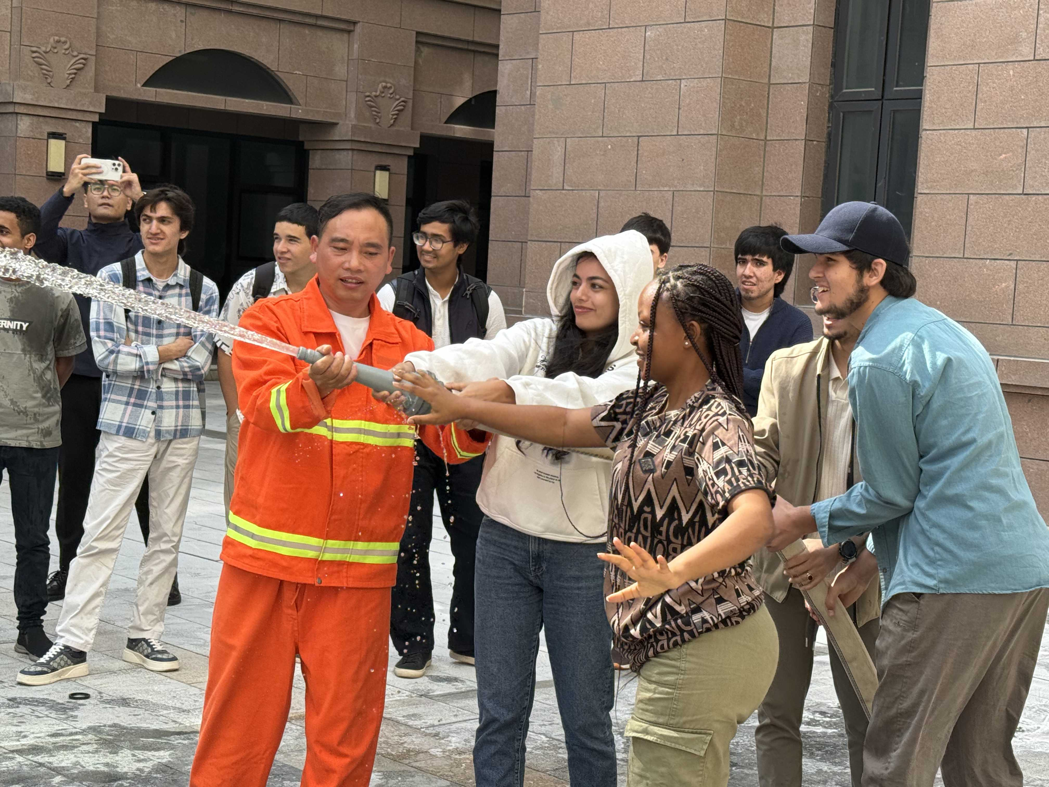 随后进入实践操作环节,消防教官和国际学院老师以双语形式现场解读各类消防设施的功能及保养方法,并指导国际学生亲自尝试灭火器“提、拔、握、压”操作,练习铺设和使用消防水管,切实提高他们在初期火灾扑救中的实战能力。